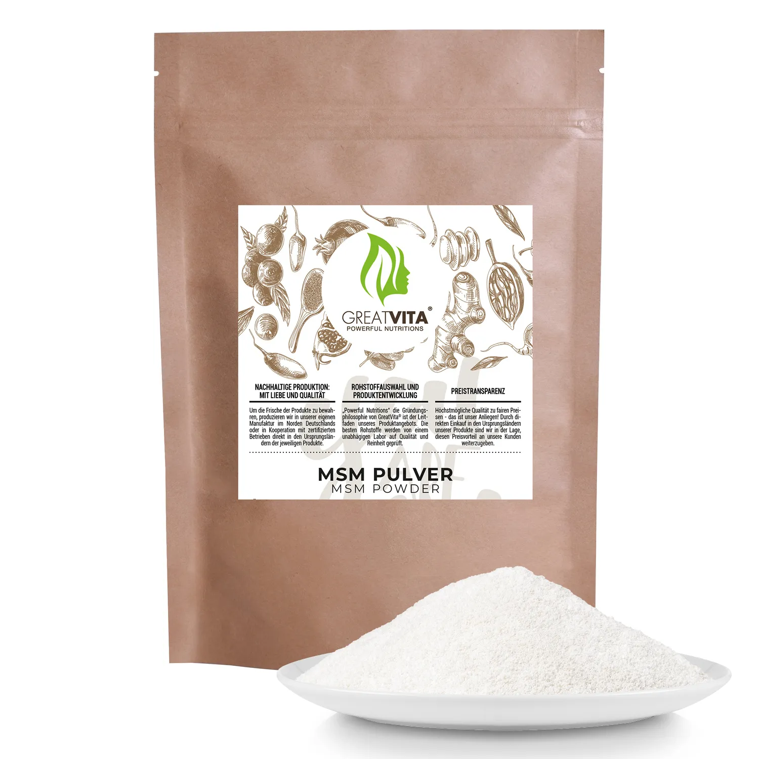 • HOCHWERTIG UND REIN. GreatVita MSM ist zu mindestens 99,9% rein und frei von Gentechnik, Farb- und Süßstoffen, künstlichen Aromen und anderen Chemikalien.