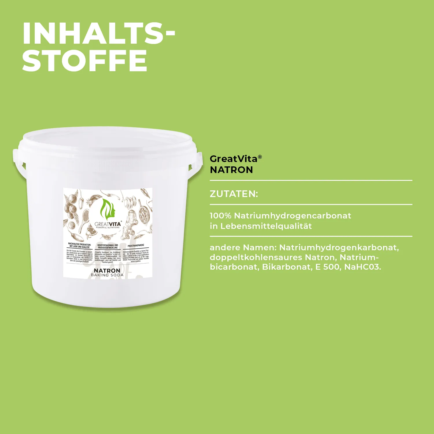 Vertrauen Sie auf die Premium-Qualität von GreatVita Natron Pulver. Unser Produkt bietet Ihnen eine ökologische und hochreine Lebensmittelqualität, um Ihren kulinarischen Kreationen und Ihrer Körperpflege eine natürliche Frische zu verleihen.