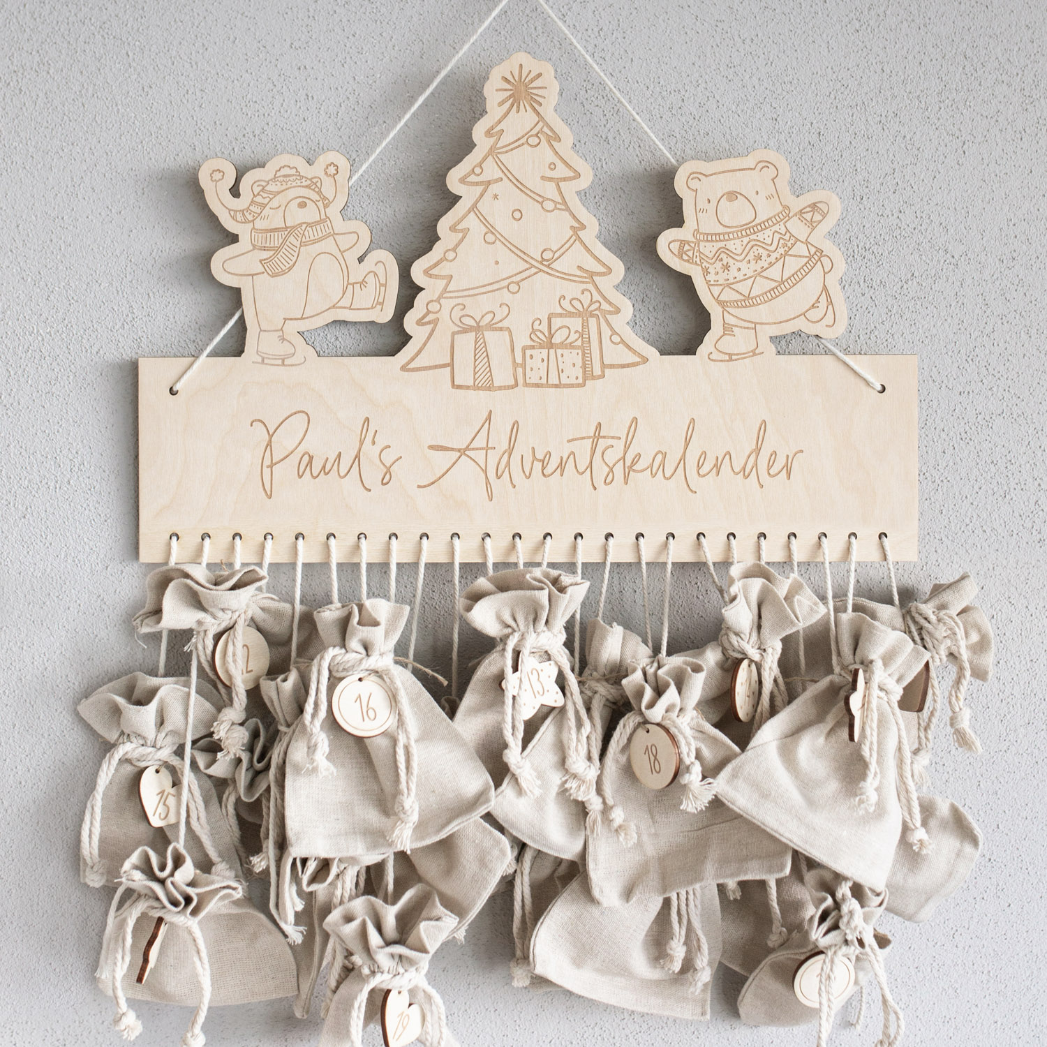 Weihnachten rückt immer näher und so langsam kann der Adventskalender für Klein und Groß vorbereitet werden. Mit unserem personalisiertem Adventskalender aus Holz kannst du ganz individuell kleine Pakete gestalten und anschließend anhängen. Die zuckersüßen schlittschuhfahrenden Eisbären und der prachtvolle Weihnachtsbaum lässt alle (Kinder)augen strahlen!