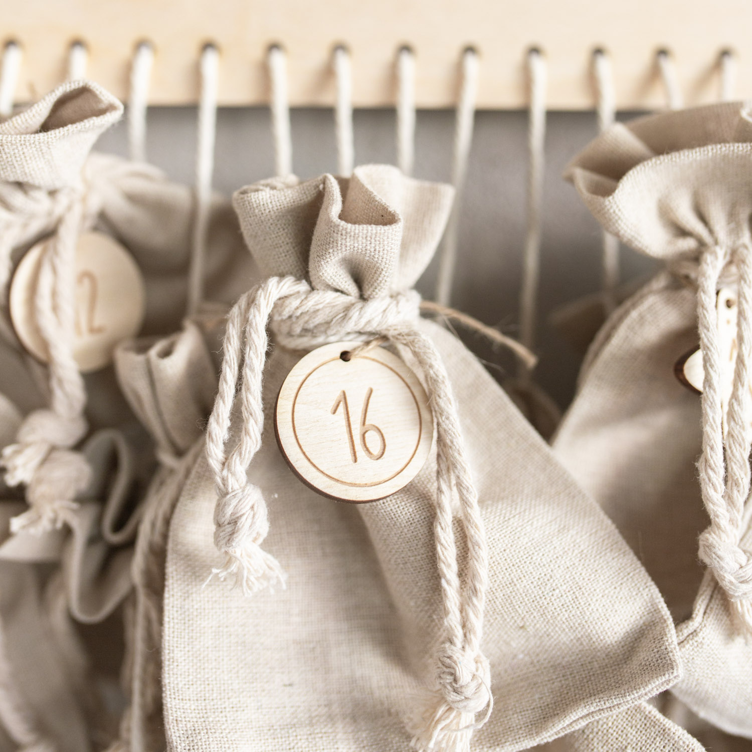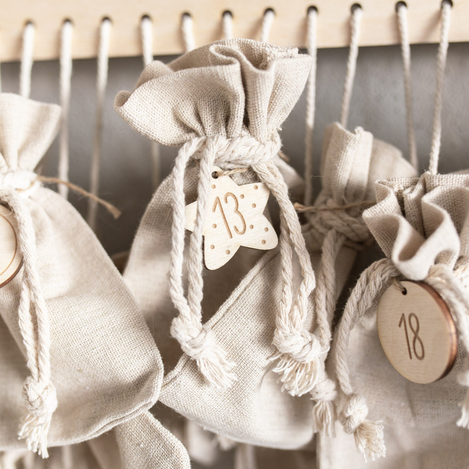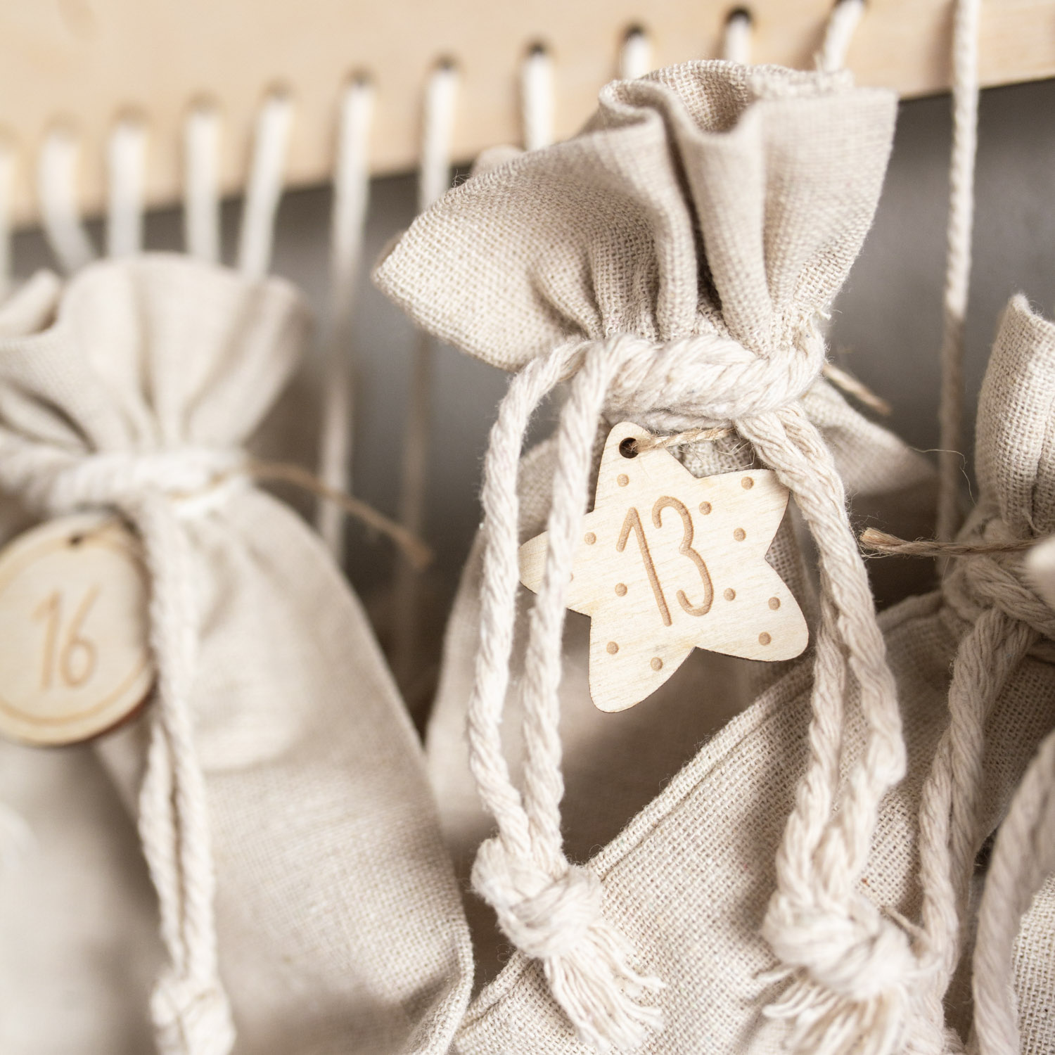 Weiterhin hast du die Wahl: entweder du wählst nur das personalisierte Holzschild und bastelst dir selber deine Säckchen und Geschenke daran oder du nimmst direkt ein Set. Dieses Set beinhaltet dann 24 Leinensäckchen in der Größe 12x15cm. Und um das Ganze abzurunden, kannst du noch 24 kleine Holzanhänger mit den Zahlen 1-24 dazu nehmen.