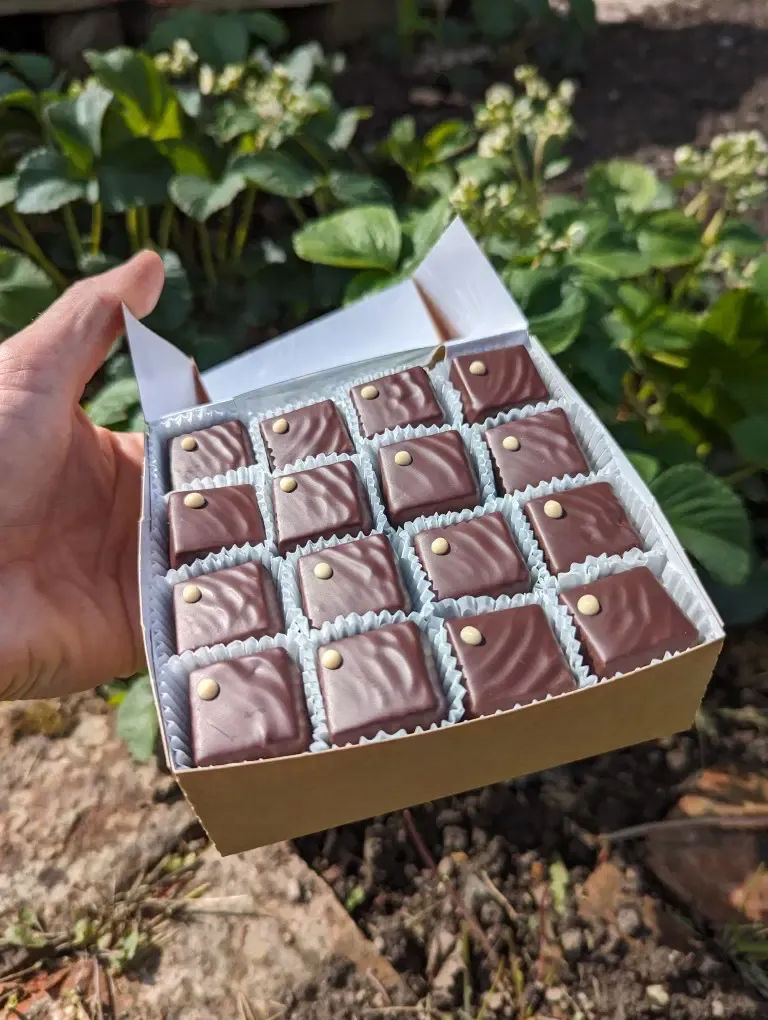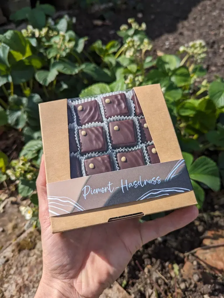 Es erwarten dich traumhaft leckere Schnittpralinen mit heller Haselnussnougat Füllung überzogen mit Schokolade aus Kakaobohnen aus Haiti.