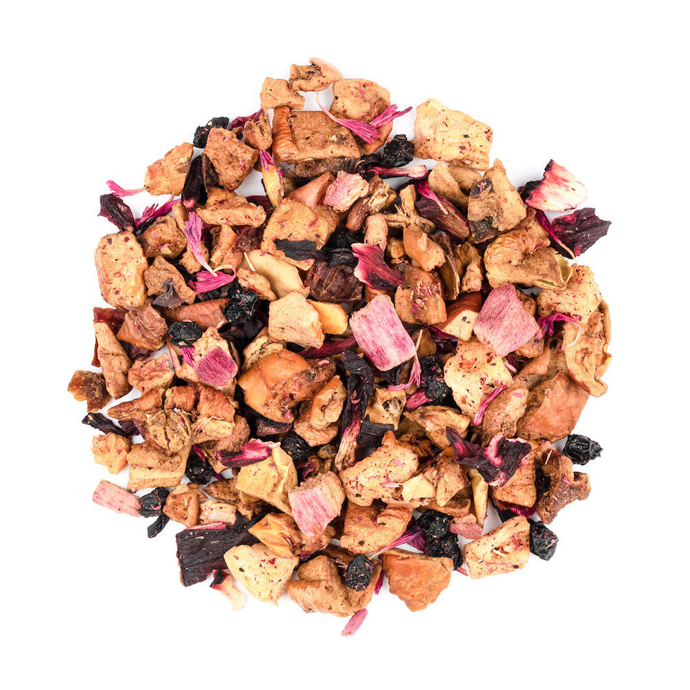 Apfelstücke, Apfelwürfel, Hibiskusblüten, Fliederbeeren, Aroma, Hagebuttenschalen, gefr.-getr. Rhabarberstücke, rosa Kornblumenblüten.
