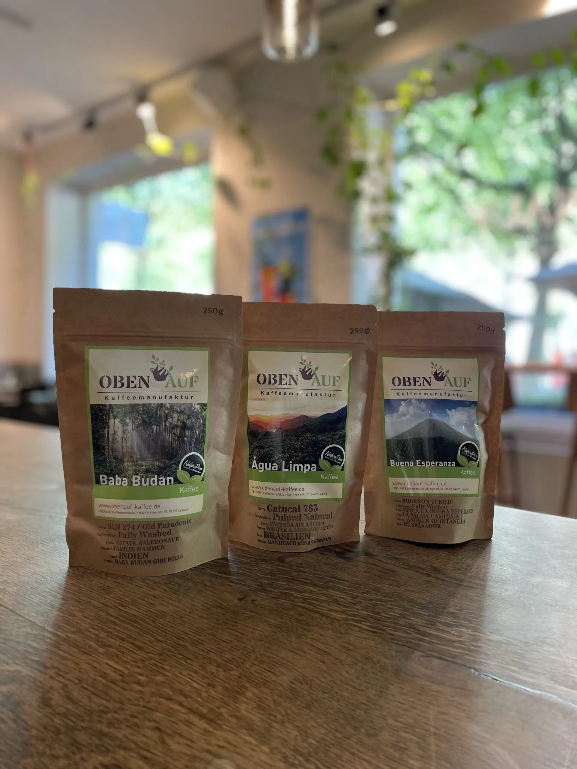 - Baba Budan – Der Klassiker: Der Baba Budan ist sehr säurearm und zeichnet sich durch seinen Kräftigen Körper aus. Er ist geradlinig und harmoniert durch seine eher nussig/getreidige Noten auch mit Milchalternativen, wie Hafermilch.