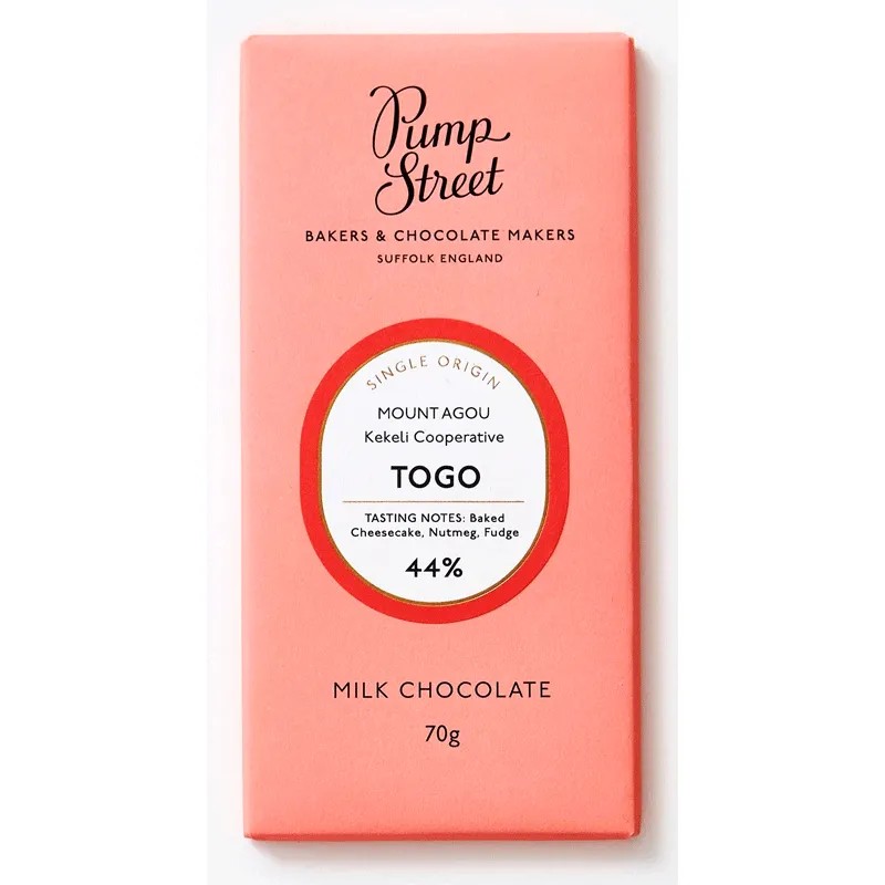 Diese besonders cremige Milchschokolade ehrt den natürlichen Buttermilchschokoladengeschmack der togolesischen Bohnen, ist aber dennoch Pump Street Chocolates eigene Version einer „Schweizer Milchschokolade“ mit Noten von gebackenem Käsekuchen (bis hin zum Biskuitboden), Molkenkaramell und warmen Gewürzen.