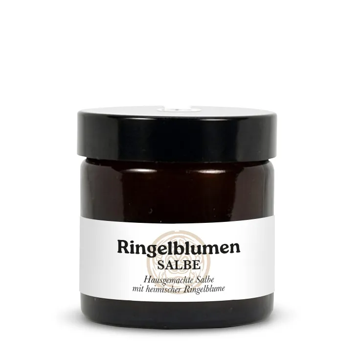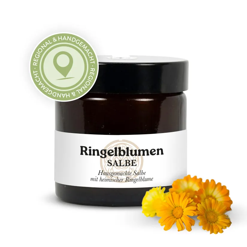 Hausgemachte Salbe mit heimischen Ringelblumenblüten aus unserem Mariazeller Wildkräutergarten (800m Seehöhe). Beruhigend und regenerierend.