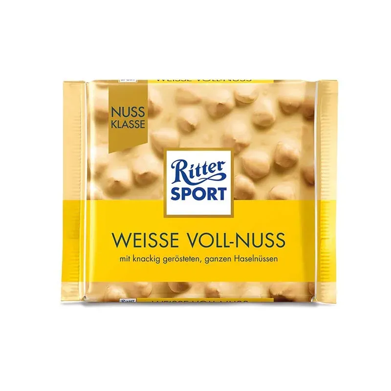 Seit 1990 bringt die RITTER SPORT Weisse Voll-Nuss weiße Eleganz in unser buntes Sortiment. Und weil sie so etwas Besonderes ist, machen wir für sie aus westafrikanischen Kakaobohnen ausnahmsweise mal keine leckere Kakaomasse, sondern verwöhnen die Schokoladenmasse mit 27% feinster Kakaobutter. Und dann wären da noch das gute Milchpulver und eine Prise Vanille. So wird die Weisse Voll-Nuss zu einer Schokolade, die ihren Namen mit Stolz tragen kann.