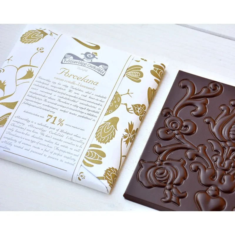 Diese Schokolade Porcelana ist das Flaggschiff von Rózsavölgyi Csokoládé! Die Kakaobohnen aus Venezuela – und nur diese dürfen den Namen „Porcelana“ tragen – sind sehr selten und werden aufgrund ihrer schimmernden, beinahe weißen Farbe so benannt.