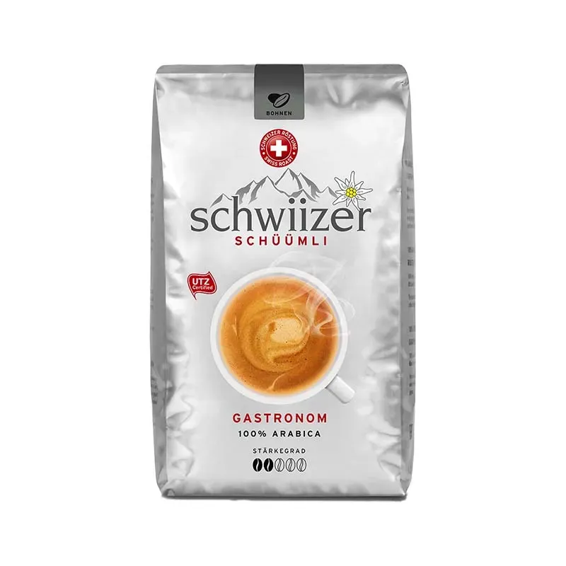 Schwiizer Schüümli Gastronom: Edle Mischung aus hochwertigen Arabicabohnen. Ein leicht nussiger Geschmack mit einer Note von Sandelholz zeichnet diesen Kaffee.