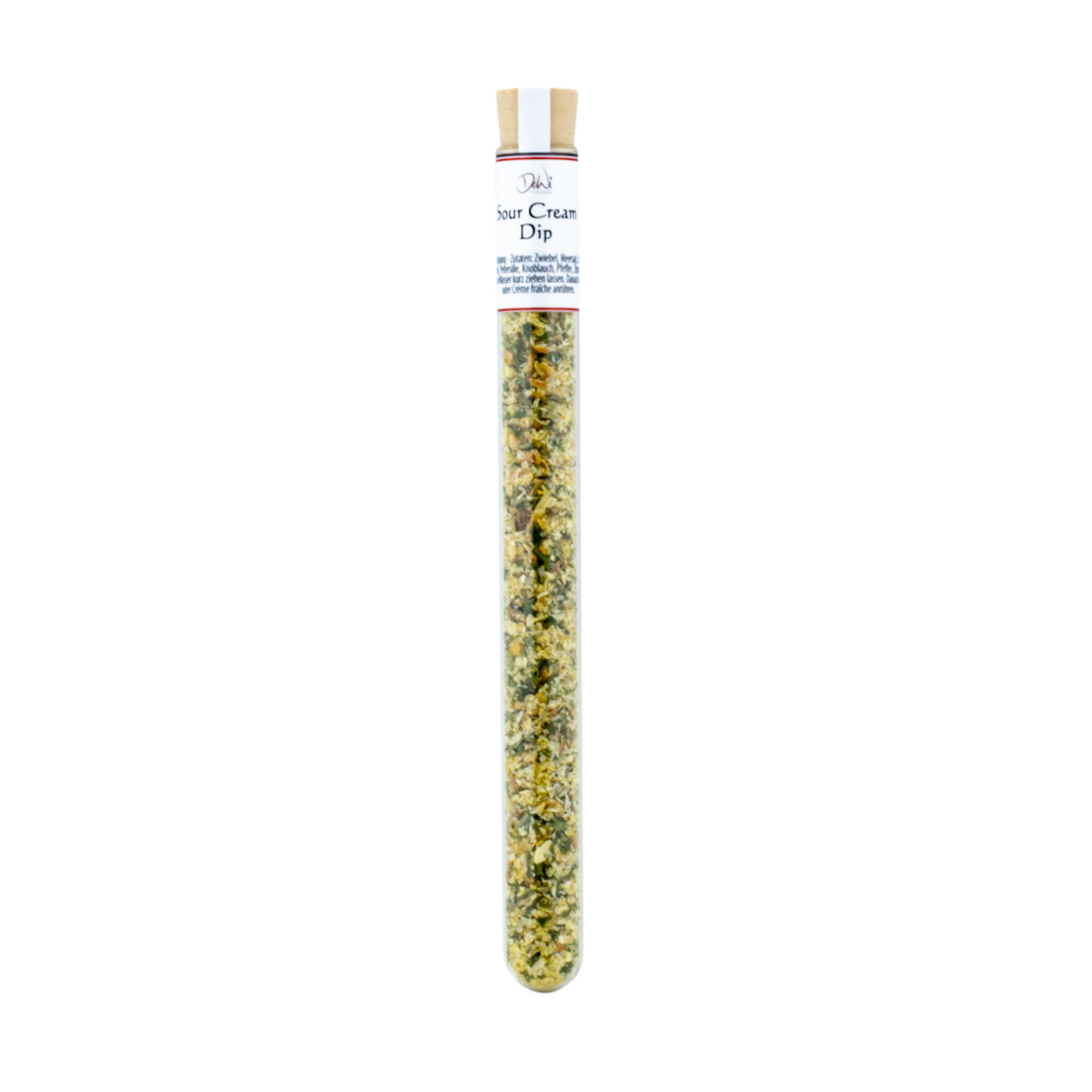Ein praktisches Reagenzglas, welches mit dem Gewürz “Sour Cream Dip” gefüllt ist. Es eignet sich hervorragend als Ergänzung zu einem Geschenk, als Teil eines Feinkost-Geschenkes oder als kleines Mitbringsel! Zudem können die kleinen Reagenzgläser perfekt auf Servierbrettern gebunden, in unsere großen Vorratsgläser oder Tassen gesteckt oder an Blumensträuße gehangen werden. Immer ein echter Hingucker!