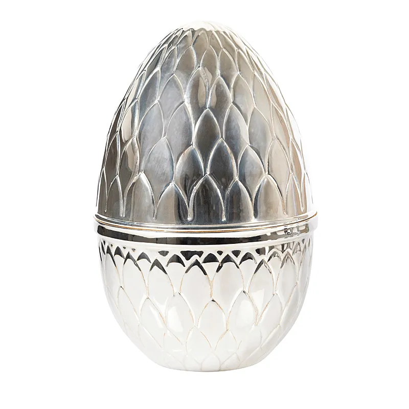 In dem versilberten Messing-Ei finden Sie eine Auswahl an klassischen Summerbird-Ostereiern und Schokoladen mit und ohne Marzipan – und zwar ganze 814 Gramm: Je eine Packung mit jeweils 4 Eiern Amber Caramel, Dark Praliné und Spring Liquorice; eine Spring Season Dark Schokolade mit 110 g; Amber & Caramel Mandeln; Mint & Rhubarb Mandeln; Amber Quail Eggs; Praliné Quail Eggs und 5 Classic Eggs.