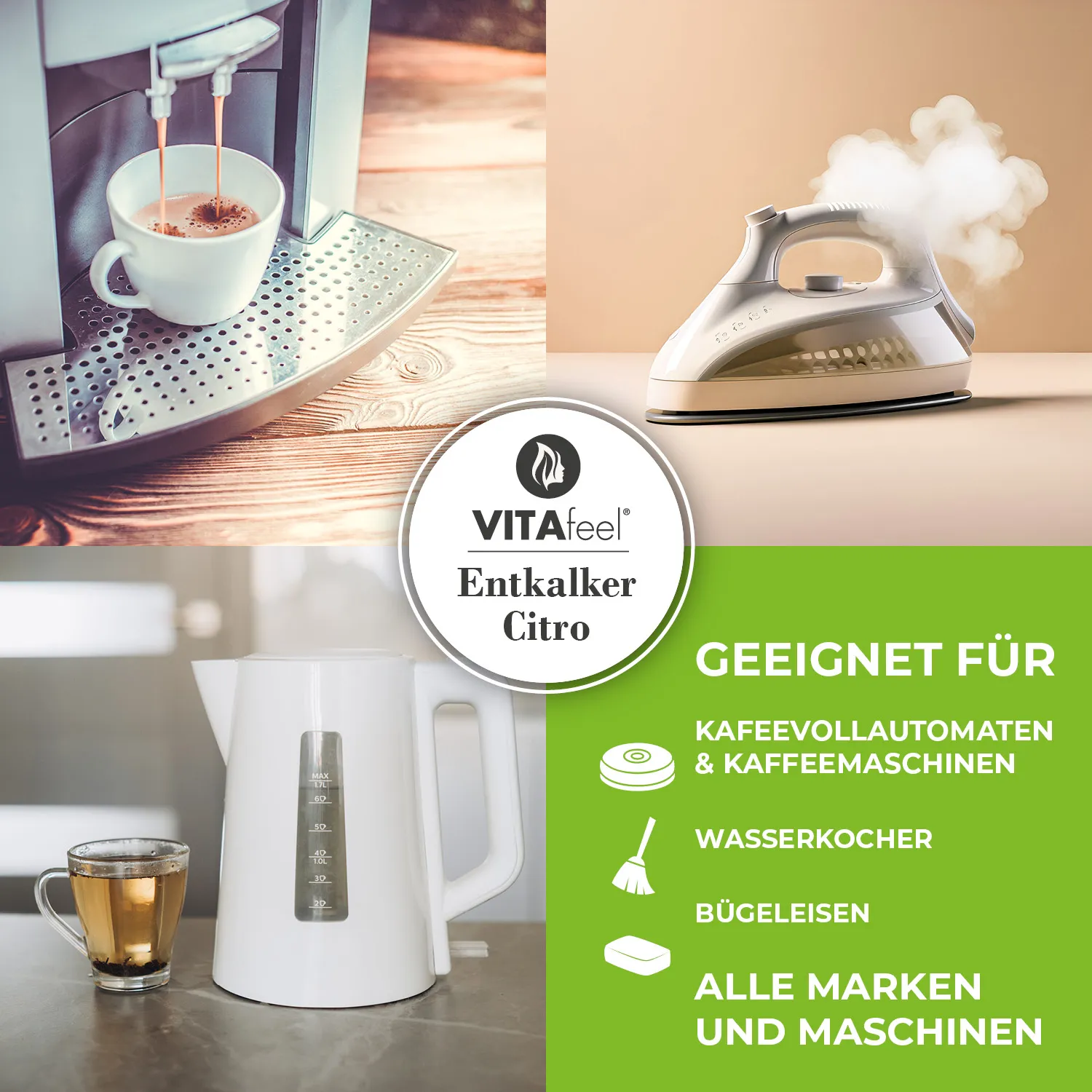 Der VitaFeel Entkalker ist nicht nur für Kaffee- und Espressomaschinen aller bekannten Marken geeignet, sondern auch für eine breite Palette von Haushaltsgeräten wie Wasserkocher, Bügeleisen und Cappuccino-Maschinen. Seine universelle Formel gewährleistet eine gründliche Entkalkung ohne das Risiko von Korrosion, verbessert den Geschmack der Getränke und verlängert die Lebensdauer der Geräte.