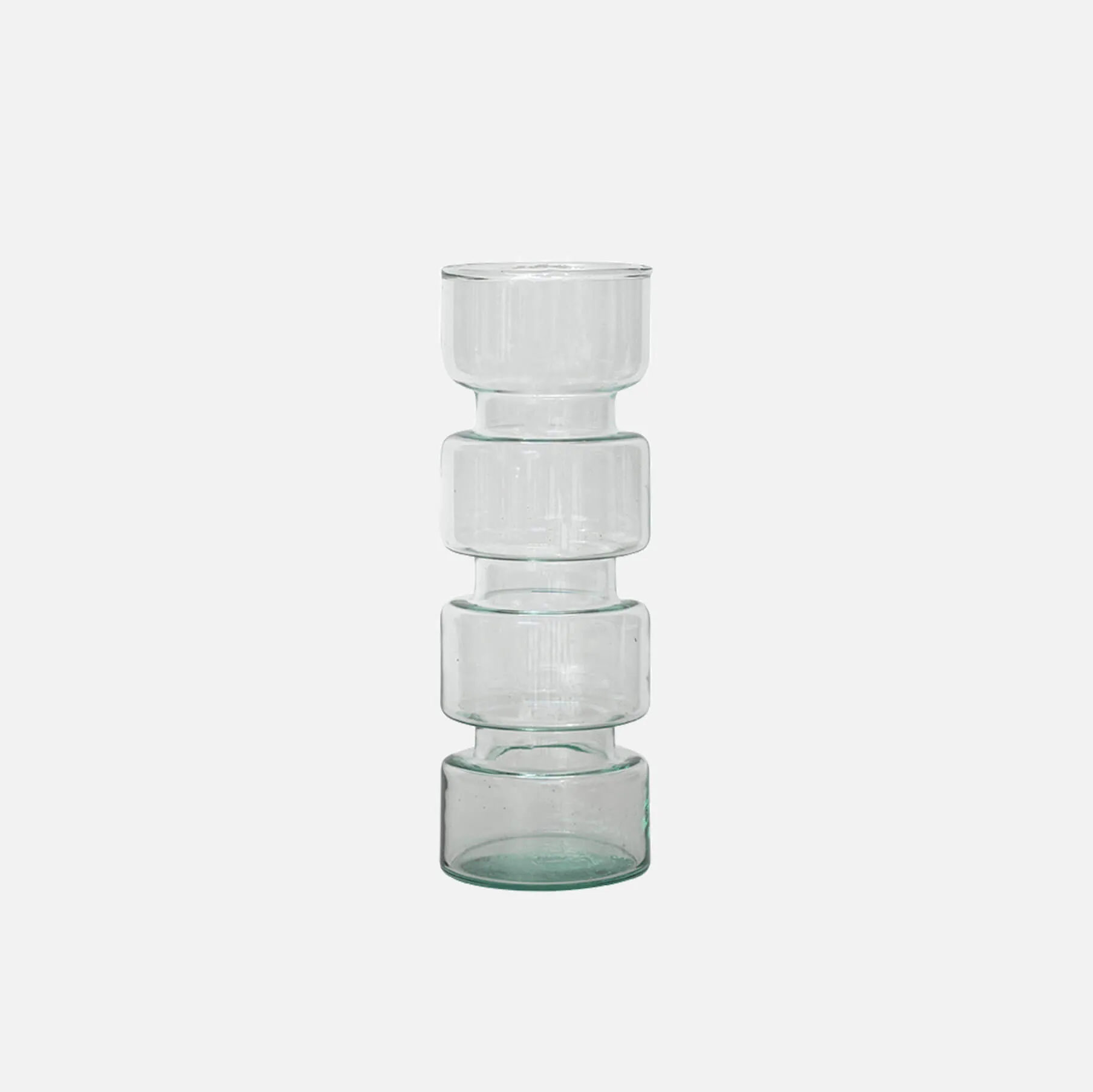 Eine Vase aus recyceltem Glas, die auch ohne Blumen wunderschön ist. Sie kann mit anderen Vasen kombiniert werden, wirkt aber auch allein sehr schön.