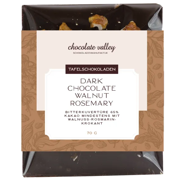 Bitterkuvertüre 65% Kakao mit Krokant aus Walnüssen und Rosmarin.