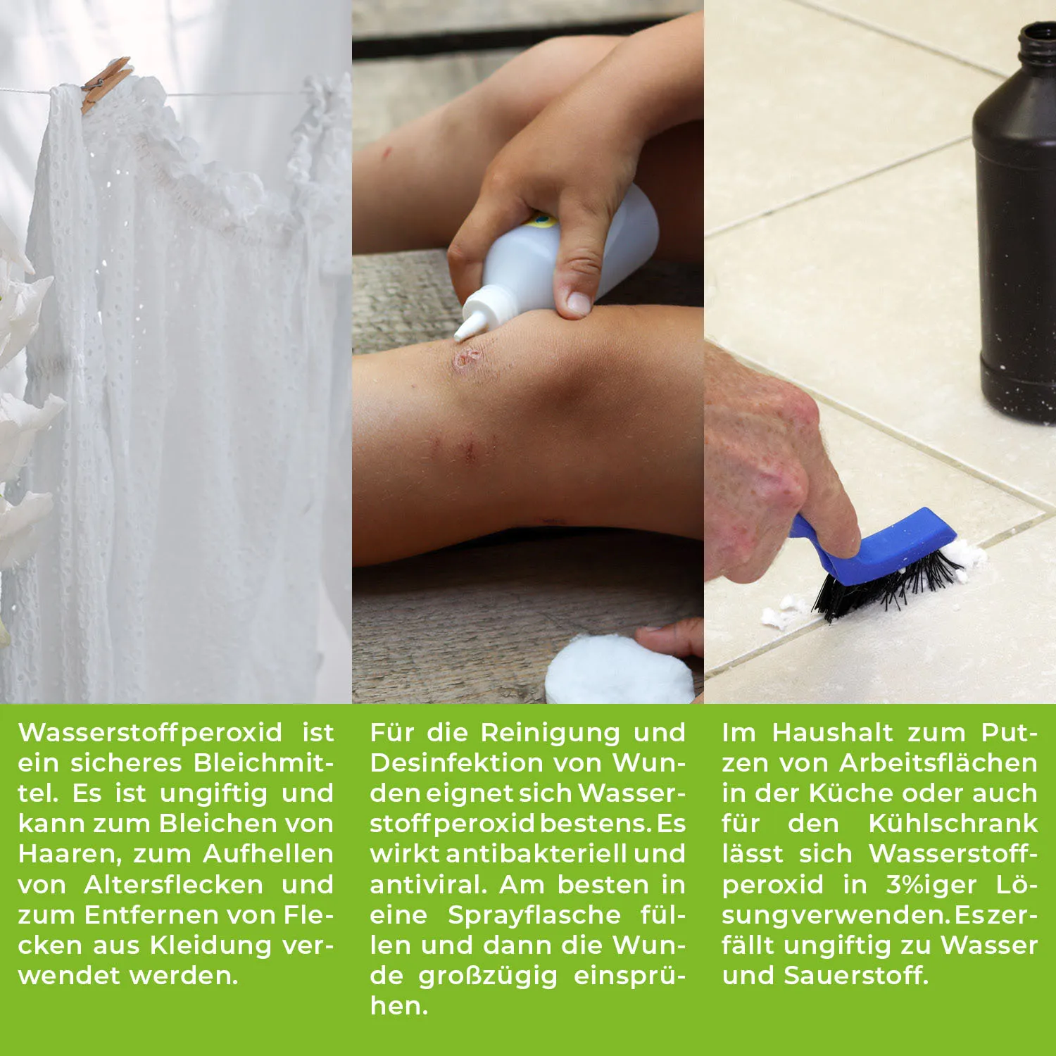 • MULTIFUNKTIONSTOOL. Wasserstoffperoxid ist so vielseitig anwendbar, wie es Buchstaben besitzt. Ob zum Reinigen, Bleichen, Aufhellen, Desinfizieren oder Beizen – mit H2O2 sind diese Probleme einerlei.