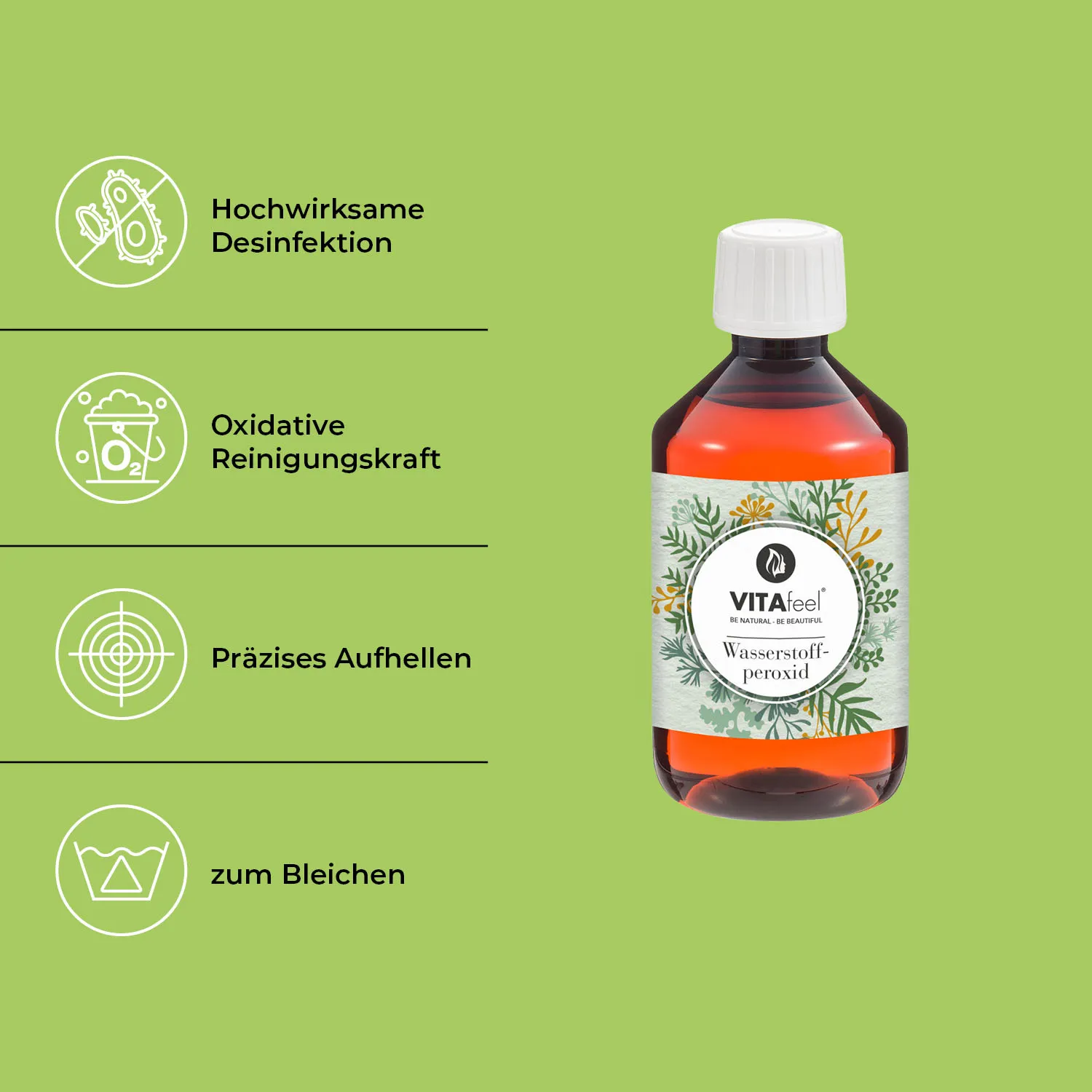 • MULTIFUNKTIONSTOOL. Wasserstoffperoxid ist so vielseitig anwendbar, wie es Buchstaben besitzt. Ob zum Reinigen, Bleichen, Aufhellen, Desinfizieren oder Beizen – mit H2O2 sind diese Probleme einerlei.