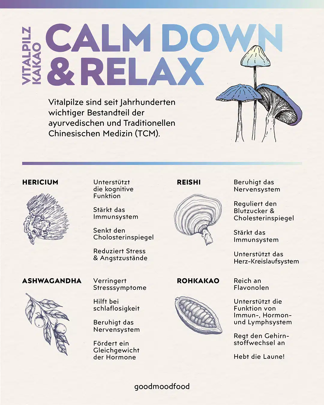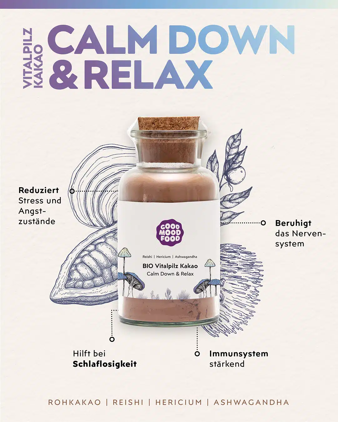 Vitalpilze (Hericium & Reishi) kombiniert mit 100% peruanischem Rohkakao und Ashwagandha bieten dir ein magisches Genusserlebnis!