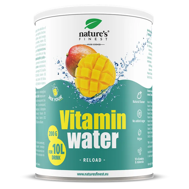 Vitamin Wasser RELOAD ist ein erfrischendes Getränk mit Mango-Geschmack, das den täglichen Bedarf an 10 Vitaminen und Mineralstoffen ergänzt, die den normalen Energiestoffwechsel unterstützen. Magnesium und die Vitamine B2, B6 und B12 reduzieren die Müdigkeit und Zink unterstützt die normalen mentalen Funktionen.