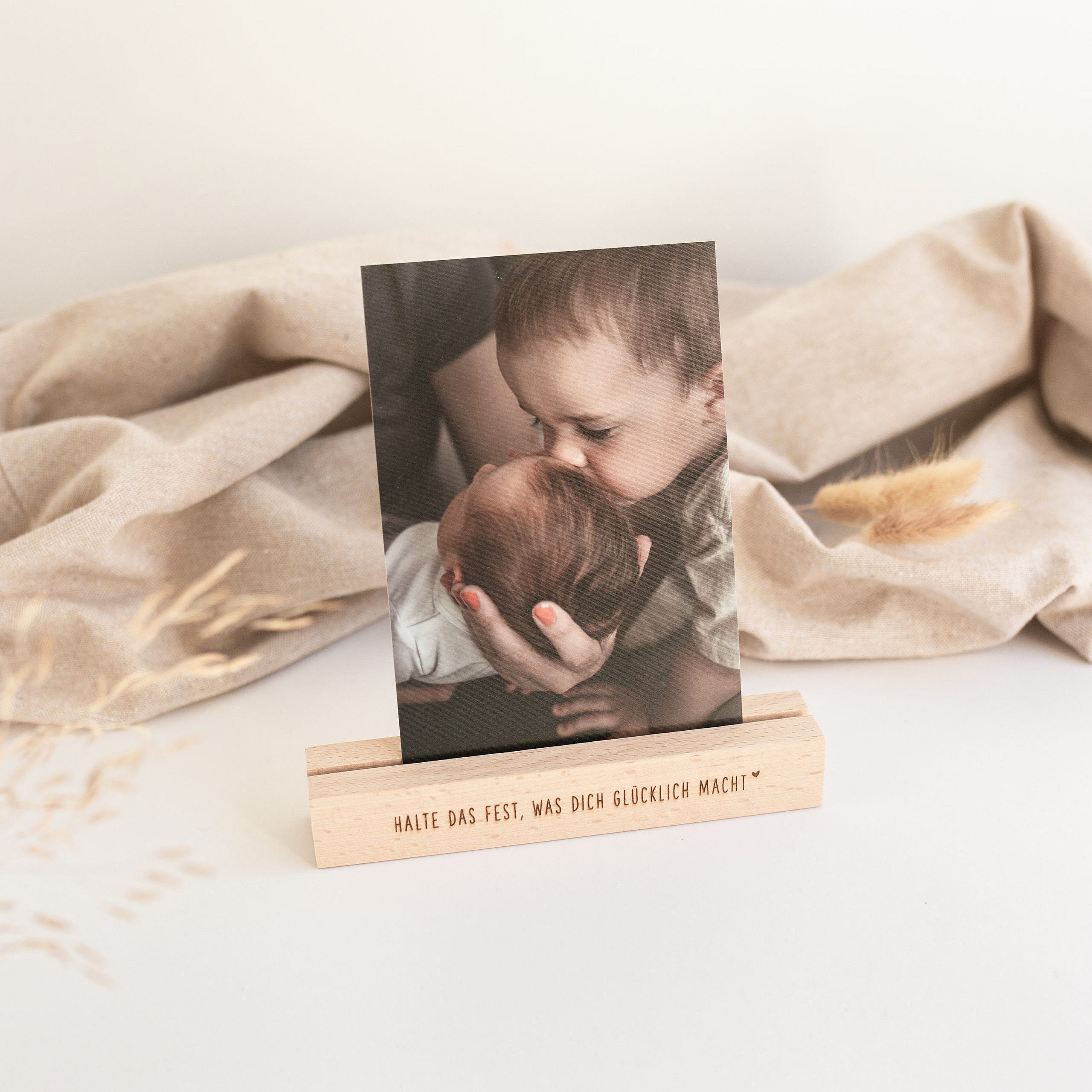 Mit diesem Kartenhalter setzt du Fotos, Postkarten, Tisch- oder Menükarten perfekt in Szene. Der Fotohalter ist mit dem Spruch “Halte das fest, was dich glücklich macht” graviert.