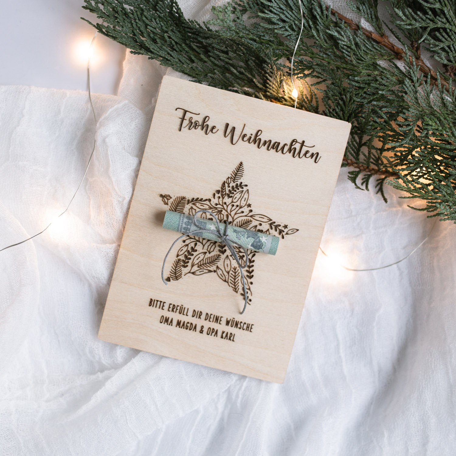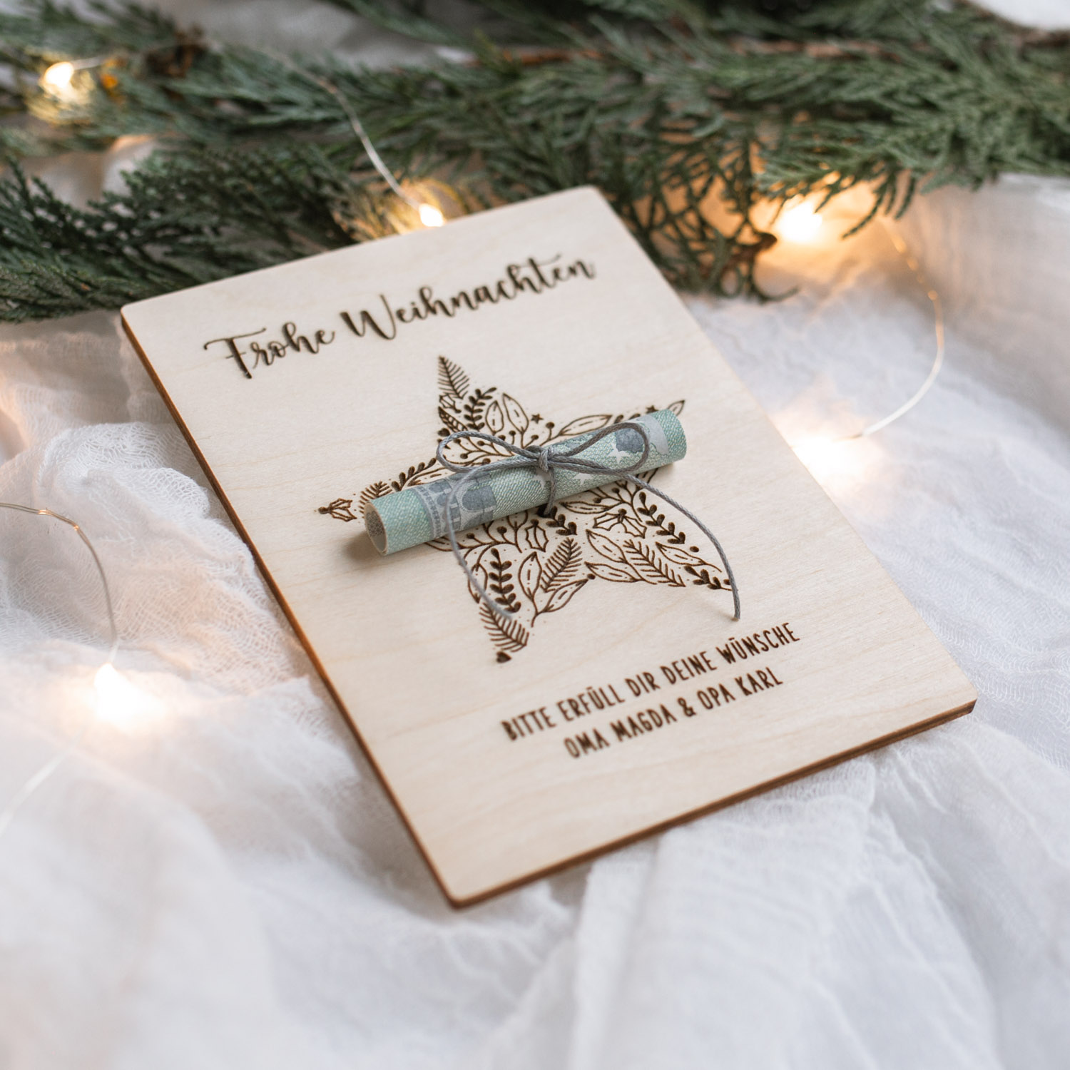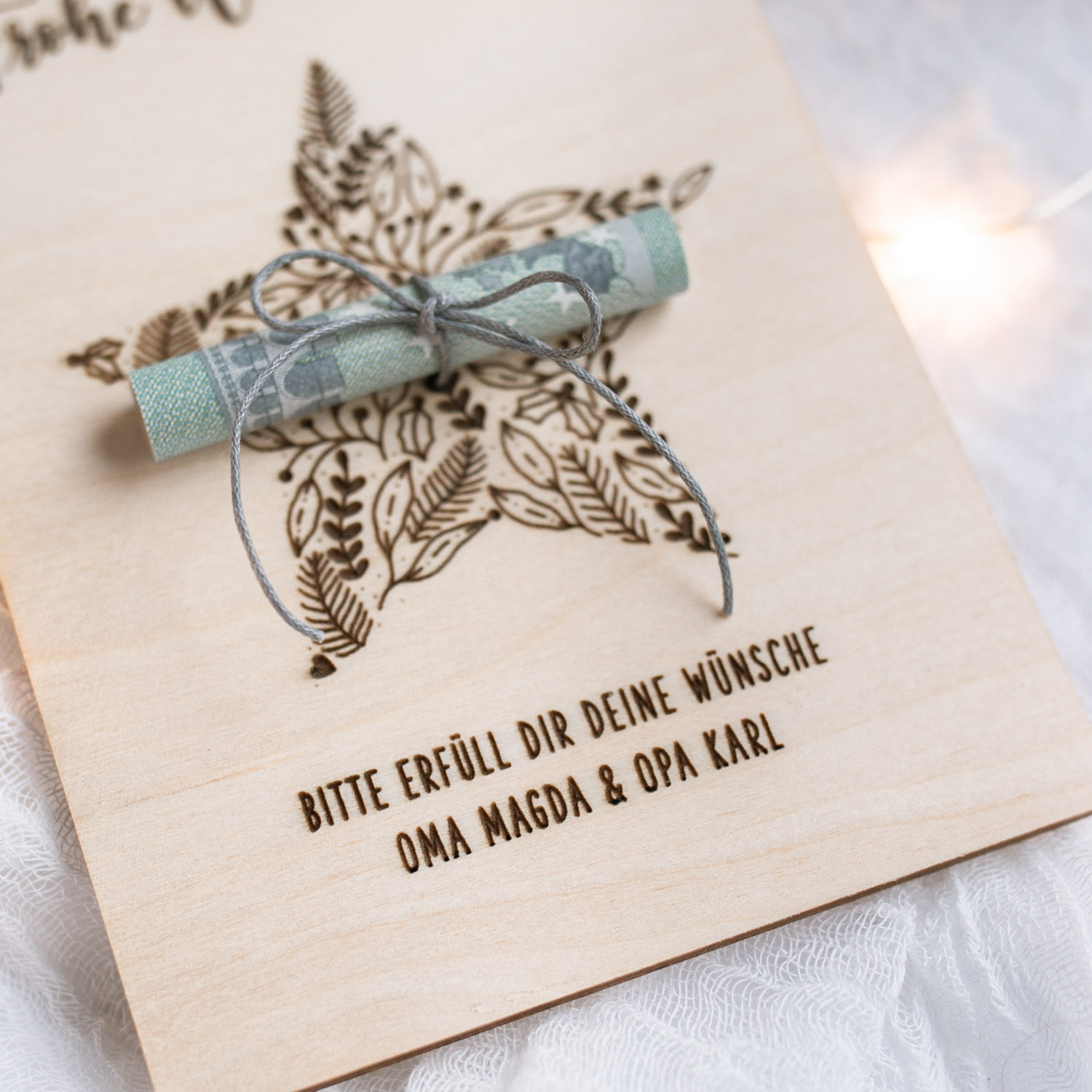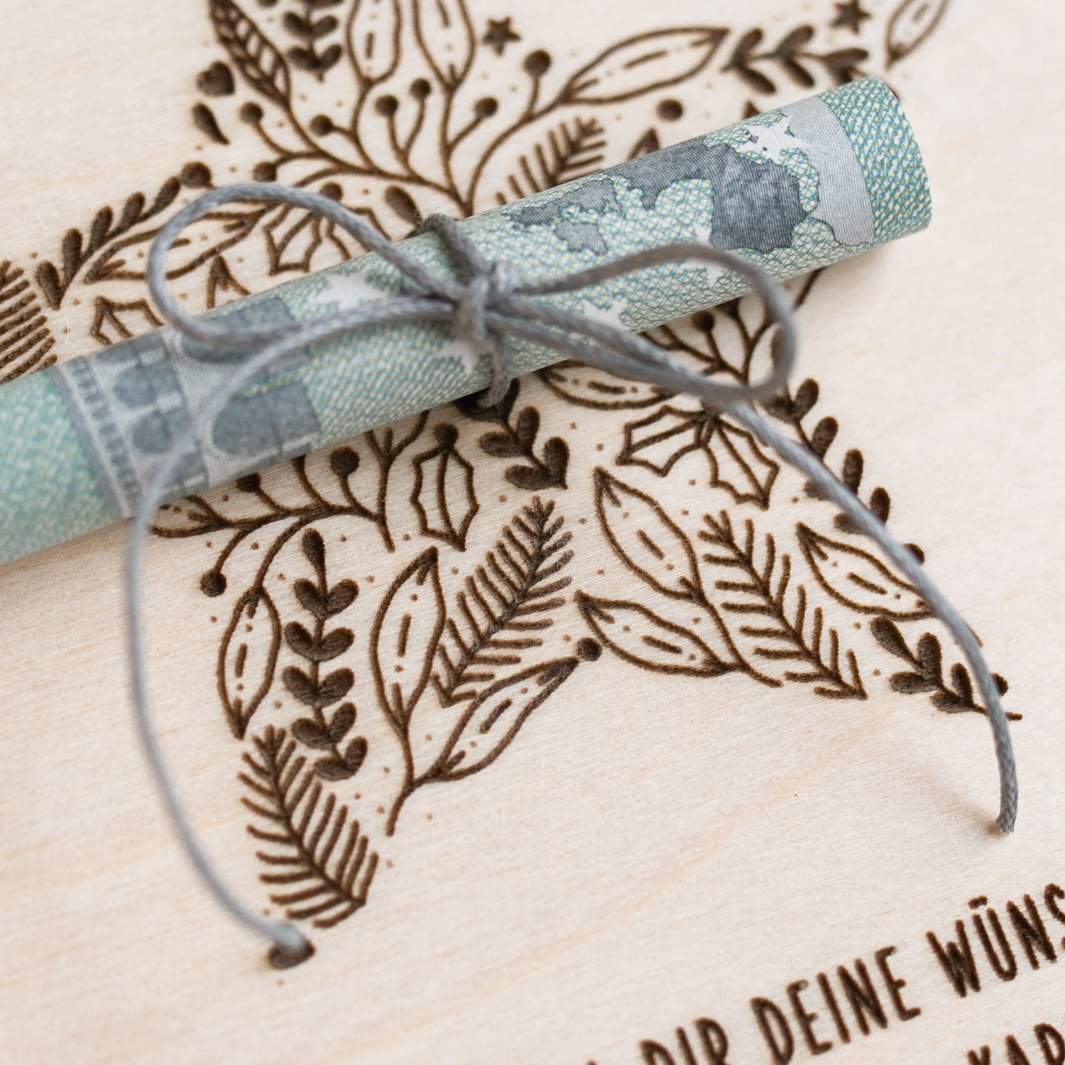 Die Karte aus Holz kann mit einer kurzen persönlichen Nachricht von dir und auf Wunsch auch mit dem Namen des Beschenkten individualisiert werden! In der Mitte der Karte befinden sich zwei Löcher, damit du dort mit einem Faden oder einem Geschenkband das gerollte Geld anhängen kannst.